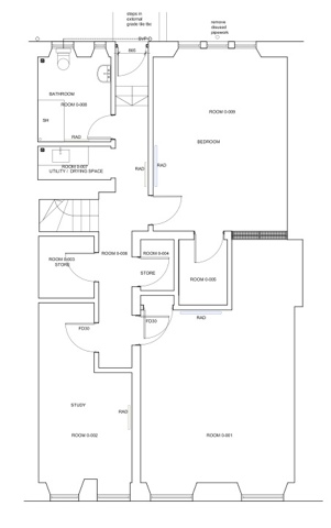 So, to help explain the layout of the house, I thought it would be fun to share a post each week detailing the plans for each of the floors in our townhouse. It made sense to start at the bottom and work my way up, so this week you get the basement. The first picture below is a snapshot of the architect's plans, you can't really read the narrative on them, but I think it helps show the layout of the floor. The back garden is at the top of the drawing below and the front of the townhouse is at the bottom.