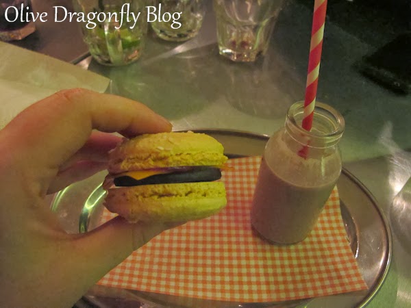 I opted for the burger & shake (£5) - a large macaron designed to look like a burger with chocolate ganache as the burger, mango jelly as the cheese and raspberry coulis for the ketchup - a great kitsch idea and really very tasty! The shake was a lovely blueberry shake served in a little milk bottle with a paper straw. I wanted to keep my straw after and they were kind enough to give me a fresh one to take home.