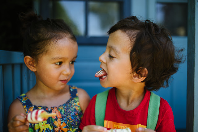 Of course, a hot day in the garden isn't complete without a Mini Twister or two (and a Nobbly Bobbly for me)! The twins adore these treats and were more than happy to get up on their playhouse porch for me to capture them eating their lollies. (Kalyan is looking exceptionally pale due to the usual Factor 50 Fight! His is not rubbed in very well!)